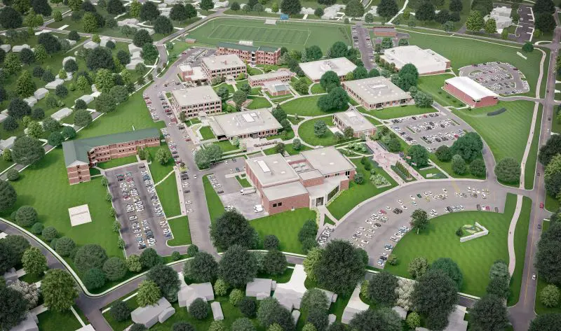 Campus: The campus spans about 50 acres, with 13 buildings including residence halls, a performing arts center, academic buildings, etc.